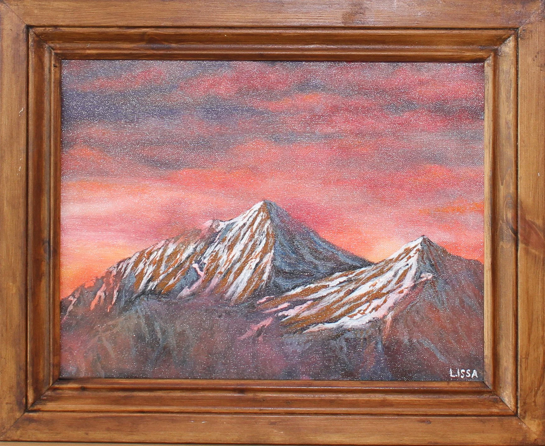 "First Light" captures the serenity of a mountain bathed in the soft hues of a pink and red sky, evoking the tranquil promise of a new day. This painting invites viewers to embrace the beauty of dawn's first rays.