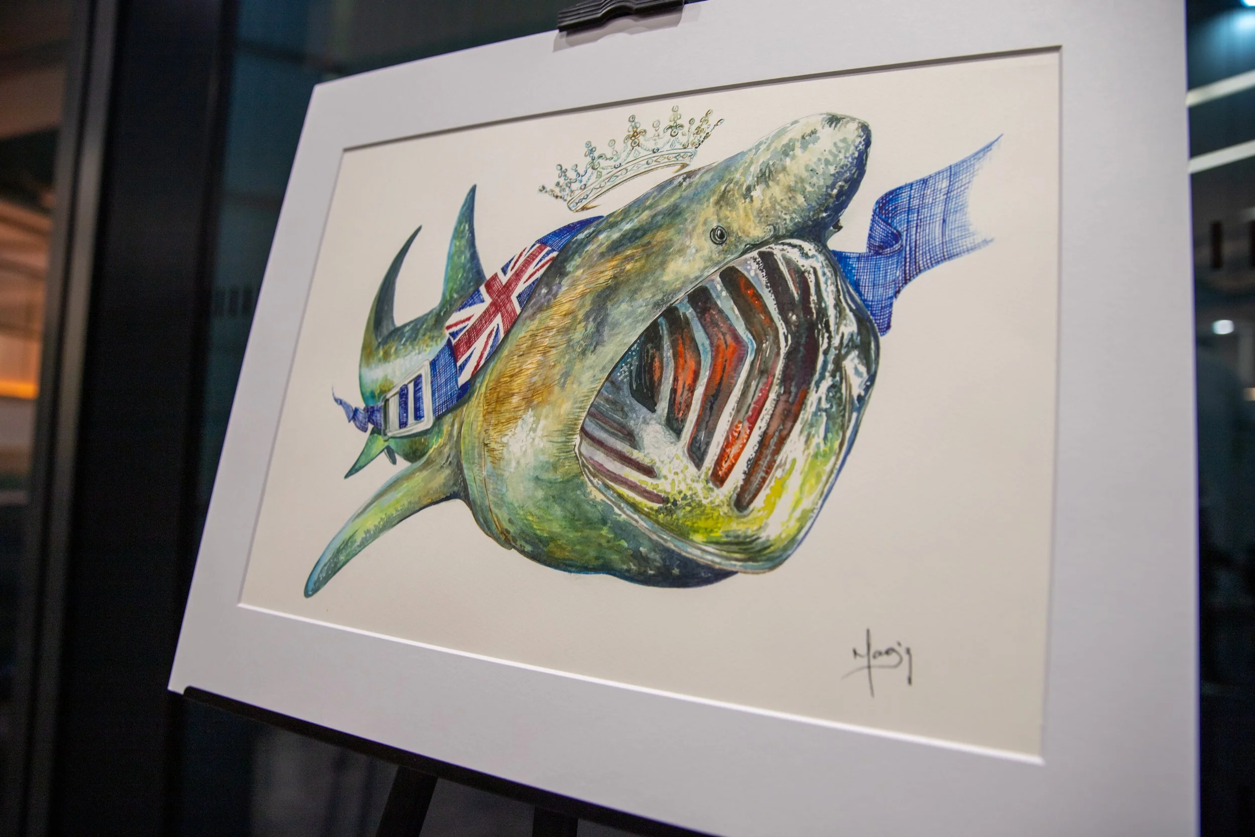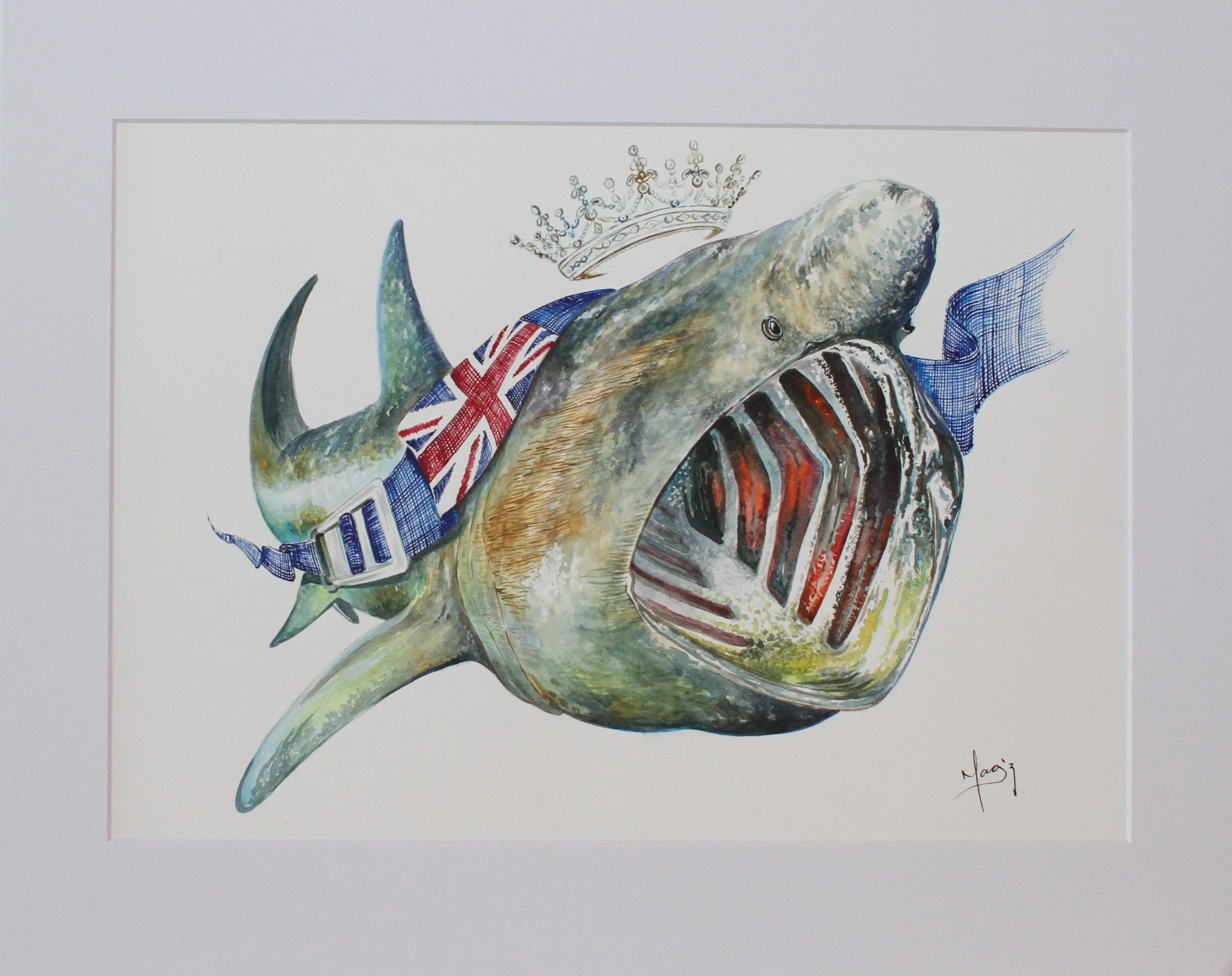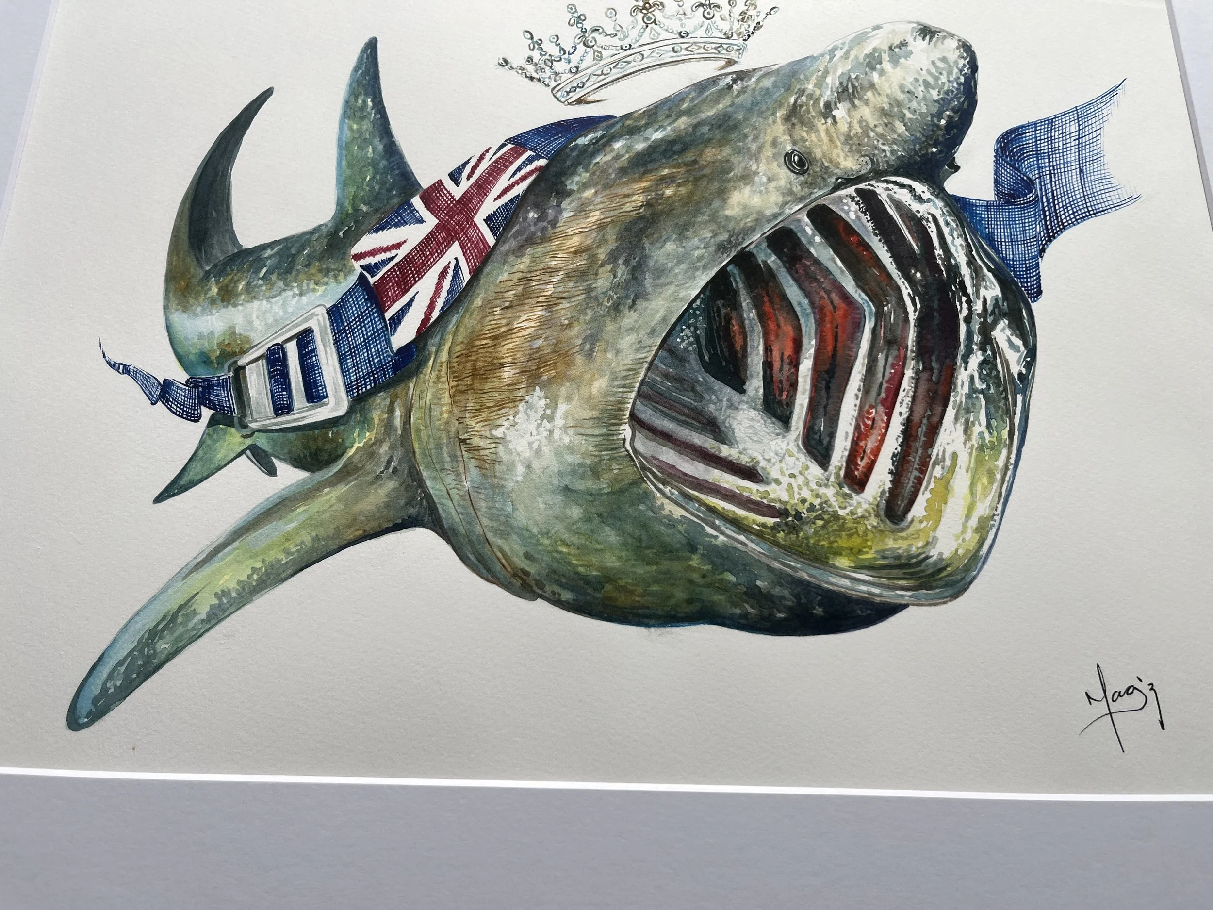 The artwork titled "Basking Shark," conceived in 2020, is part of the B.B. Series, which is inspired by the Blue Belt Programme. The Blue Belt Programme supports the UK Overseas Territories in the protection and sustainable management of their marine environments. In this beautiful series, I have depicted various species accompanied by a blue diving belt bearing the UK flag. This belt symbolizes the protection extended over each of these species. For this majestic basking shark, I have added a crown, representing the reign of Queen Elizabeth II.