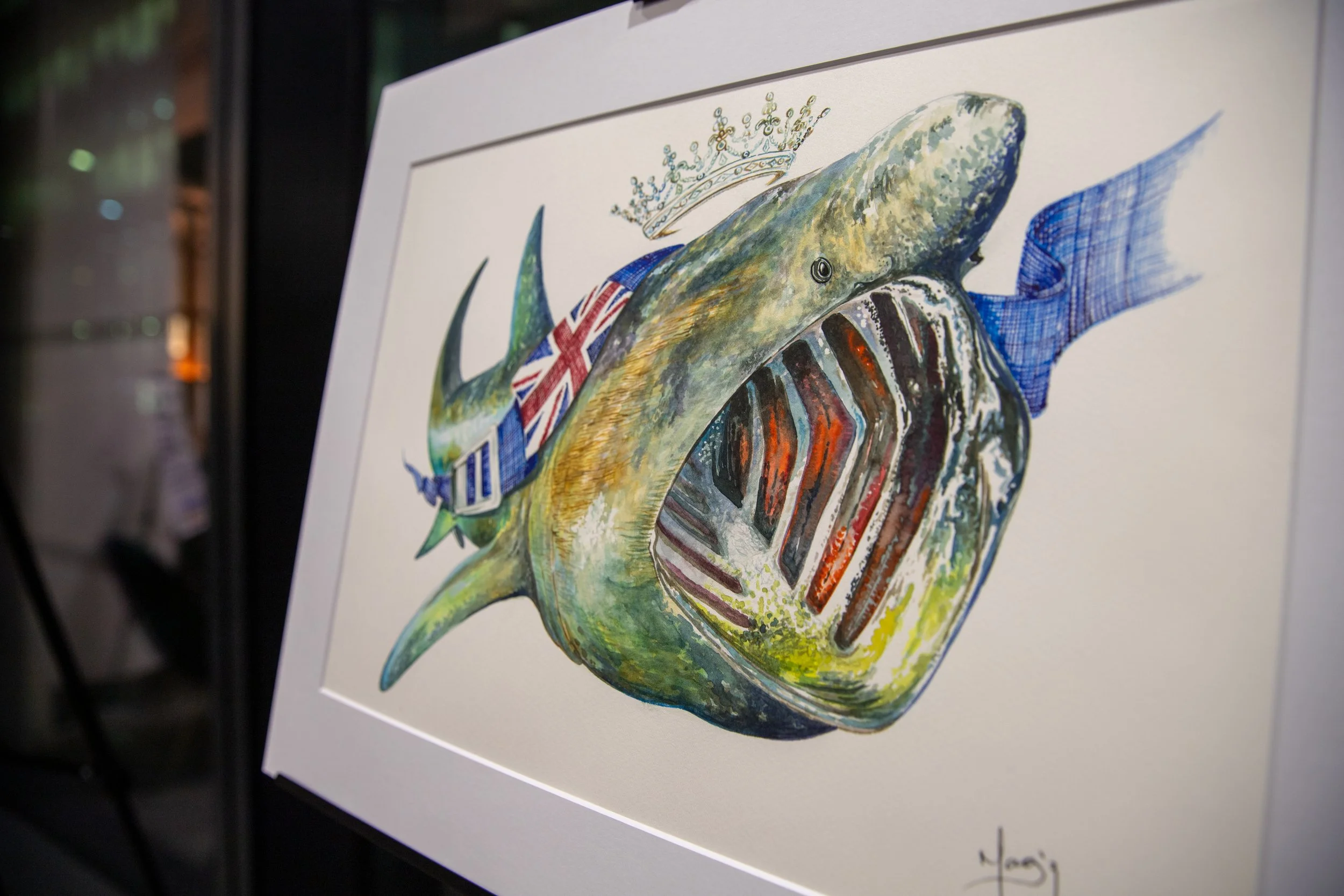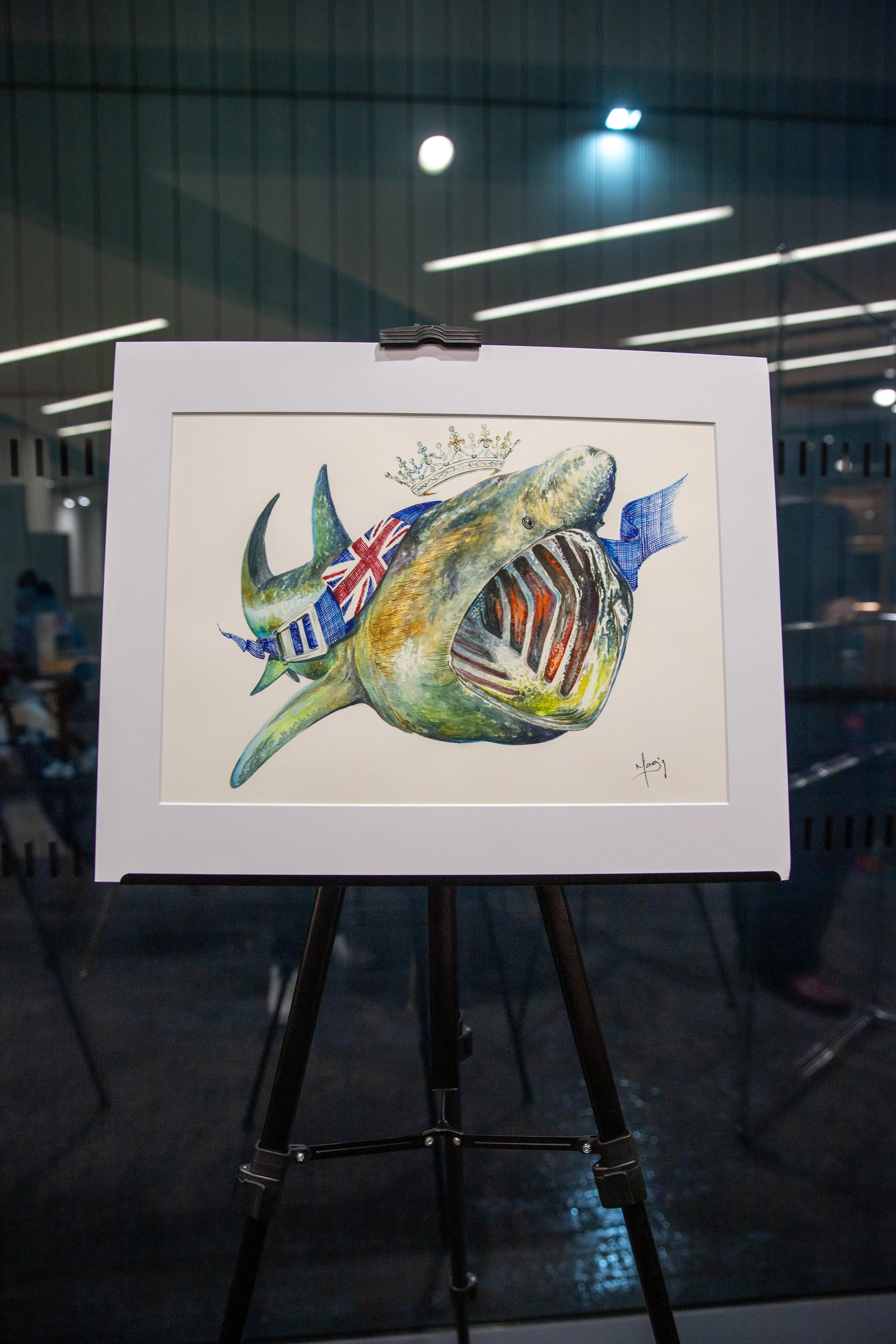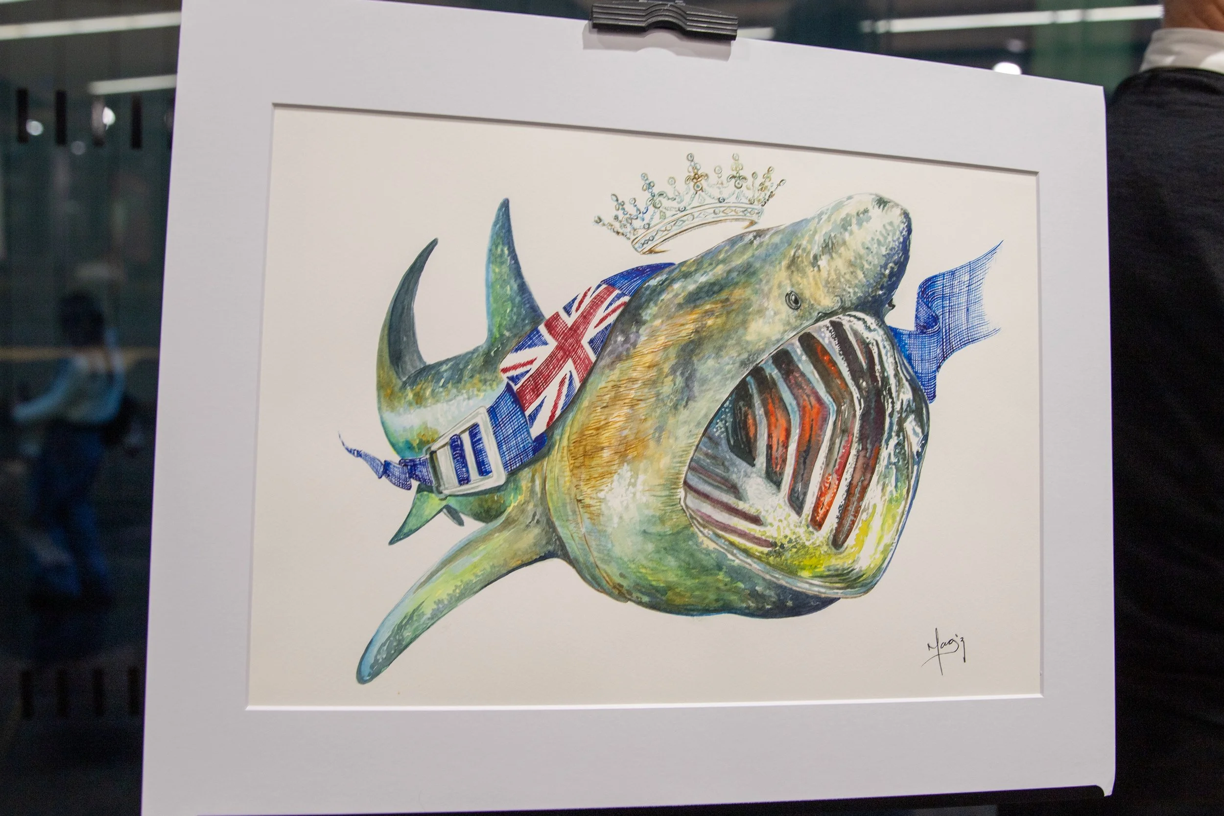 The artwork titled "Basking Shark," conceived in 2020, is part of the B.B. Series, which is inspired by the Blue Belt Programme. The Blue Belt Programme supports the UK Overseas Territories in the protection and sustainable management of their marine environments. In this beautiful series, I have depicted various species accompanied by a blue diving belt bearing the UK flag. This belt symbolizes the protection extended over each of these species. For this majestic basking shark, I have added a crown, representing the reign of Queen Elizabeth II.